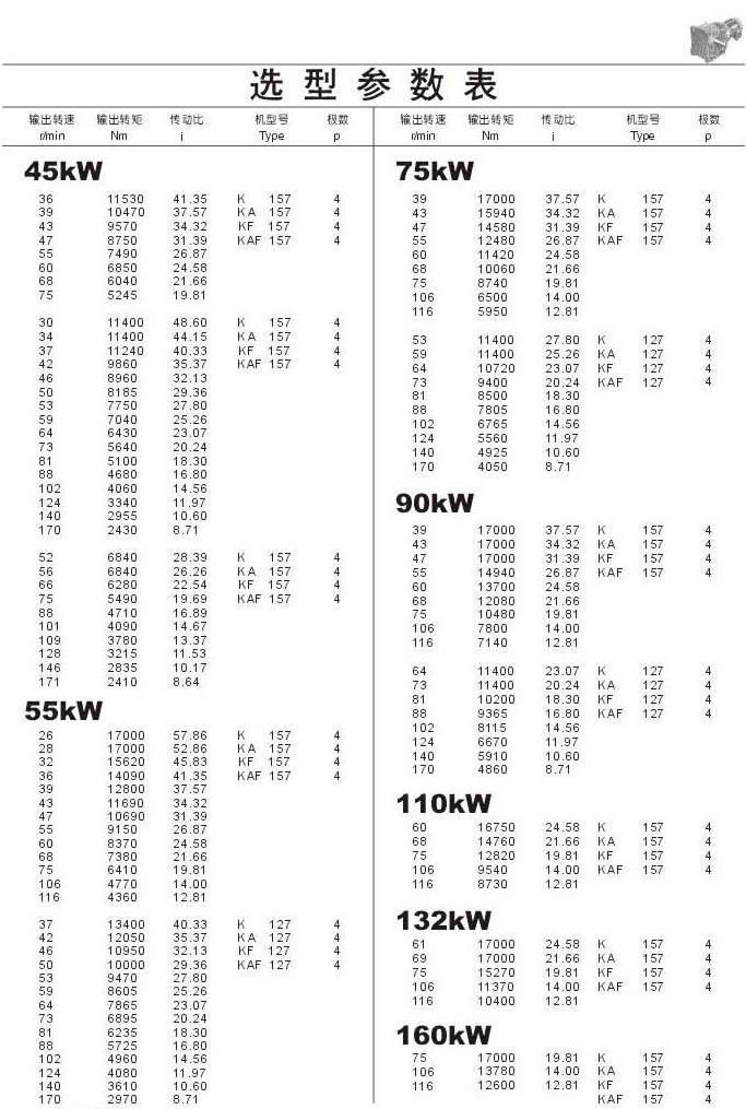 選型參數表45kW (續),55kW ,75kW ,90kW ,110kW ,132kW ,160kW