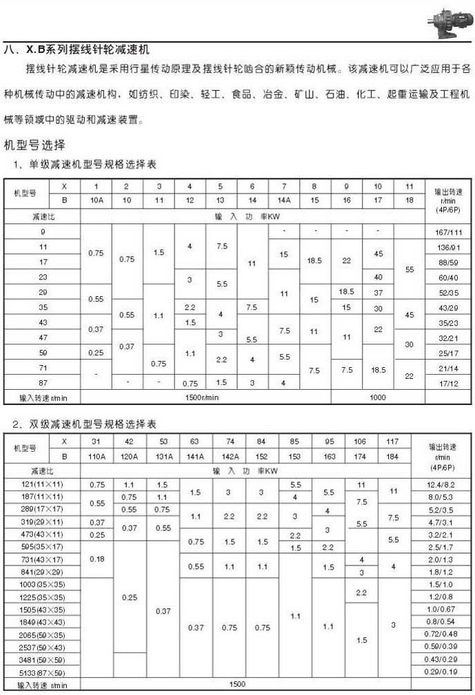 X . B擺線針輪減速機說明單級減速機型號規格選擇表雙級減速機型號規格選擇表